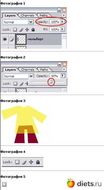 Этот параметр меняет прозрачность слою. Например, изменим прозрачность рубашки фотошоп Мастера до 60%. рис.2