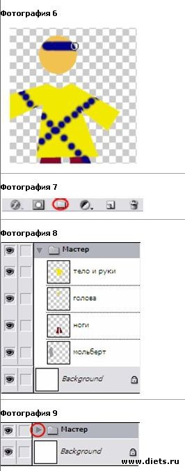 Создадим папку для всех слоев с частями тела фотошоп Мастера и перетащим все слои туда. рис.8