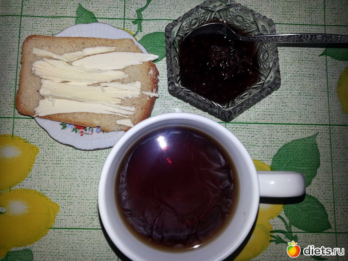 Хлеб белый с маслом сливочным с малиновым вареньем неизвестного срока производства. Чай чёрный бс.