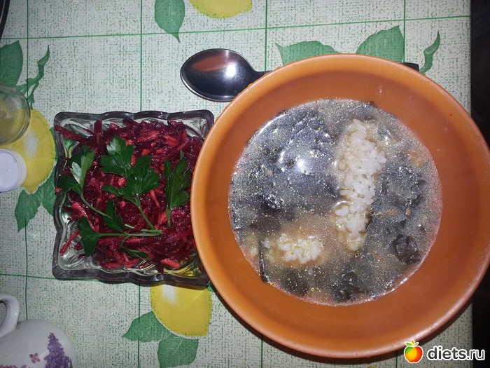 21,01,14 Обед Суп из морской капусты с паби, салат из сырой свёклы и моркови. Салат вкусный! Я думала будет гадость из сырой-то свёклы - нет))