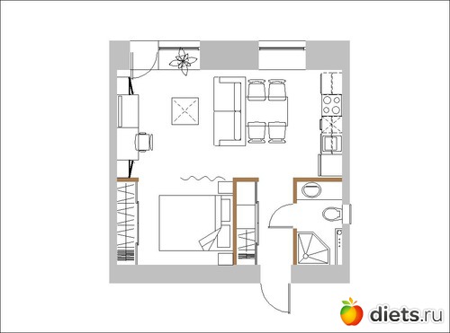 В такой квартире студии теперь есть место и для обеда с комфортом, и для сна, и для общения, и для работы. Не нужно без конца раскладывать и складывать диван: спальное место и сидячая зона автономны. Места хранения достаточно вместительны и разделены по функциям. На кухне помещается все необходимое оборудование и посуда. Санузел включает в себя все необходимое и удобен для пользования. Кроме того, с декоративной точки зрения планировка очень выигрышна: два окна в большой комнате, расположенные перед глазами вошедшего, наполняют ее светом и делают очень просторной.