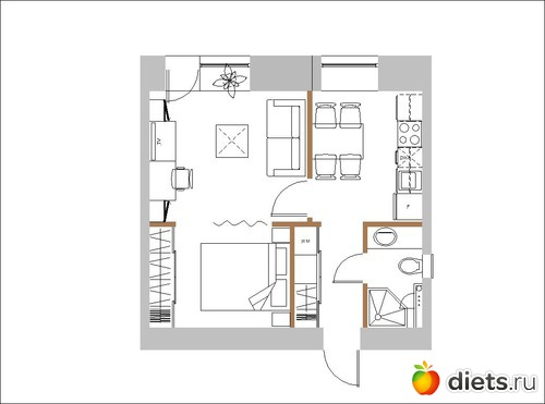 Посмотрим, сможем ли мы впихнуть все эти функции в маленькую однокомнатную квартиру 33кв.м. с тесной кухней 6,5м, да еще так, чтобы это была удобная и красивая планировка.