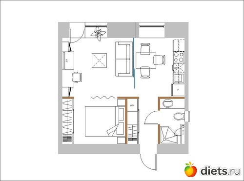 Или можно сделать полноценную перегородку с дверью, в этом случае кухня получается проходной, но проход расположен в углу и не мешает жизни на кухне. Дополнительно, такое решение дает боОльшую изолированность, если кого-то смущает перспектива "спать на кухне".