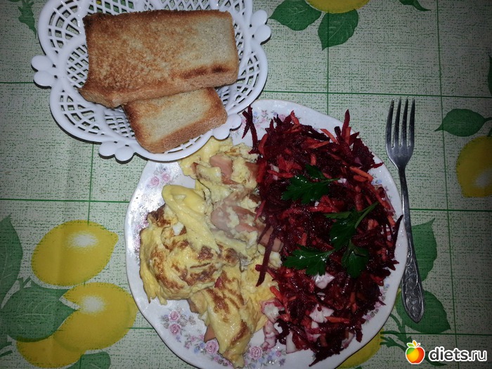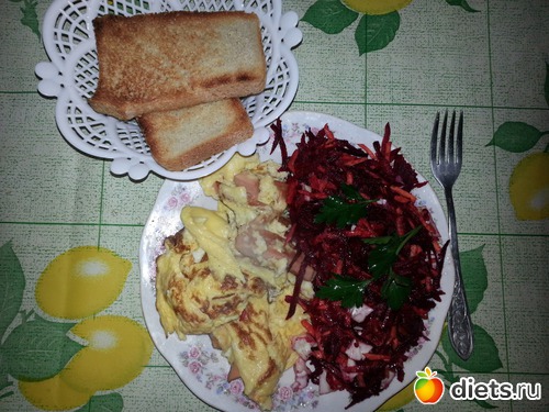 22,01,14 Завтрак 2 тоста из белого хлеба, 80 гр колбасы молочной с 3 жаренными яйцами, салат из сырых свёклы, моркови, капусты