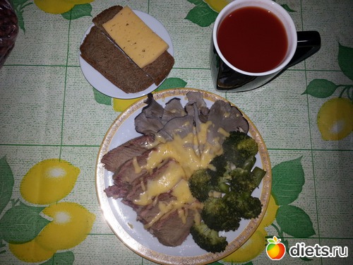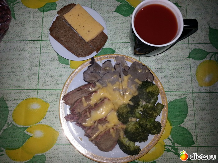 22,01,14 Ужин отварная говядина, брокколи и вешенки на пару, присыпанные сыром Король Артур, 2 куска хлеба бородинского, сыр, томатный сок из томат пасты. Ужасно вкусный ужин!!! Но опять косяк … наелась половиной порции – и один фиг, ничего не убрала и не выбросила – доела всё до той самой «чистой тарелки». Накладывать надо было самой и сразу поменьше – опять двойка …