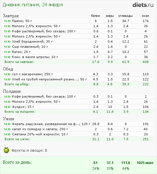 Мало фруктов/овощей. Они добавят калорий, сытости и понизят жиры