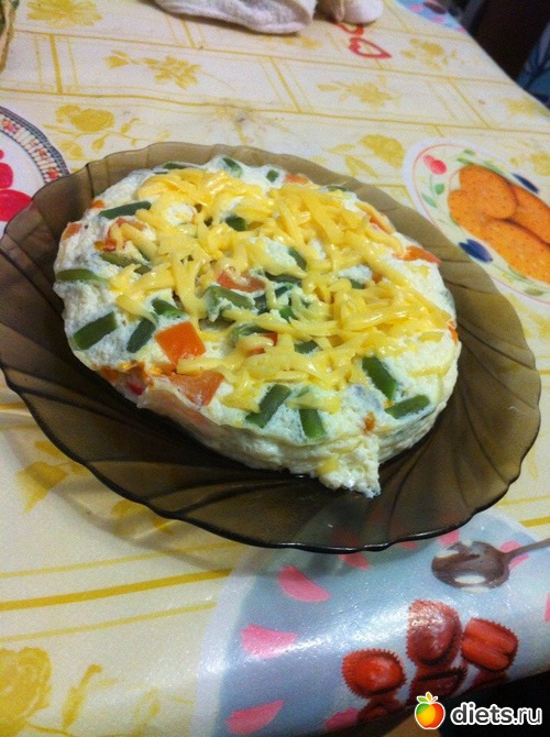 стручковая фасоль, помидор, крабовые палочки и немного готовой говядины, наверх сыр тертый) 20 минут в пароварке и готово)