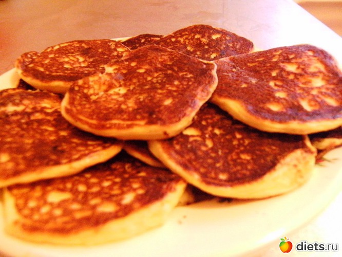 Взбиваем яйца с солью, сахзамом, разрыхлителем, крахмалом и кефиром. Добавляем творог, хорошенько вымешиваем чтоб не было комочков творога. Жарим на тефлоновой сковородке (1 капля масла растертая по покрытию