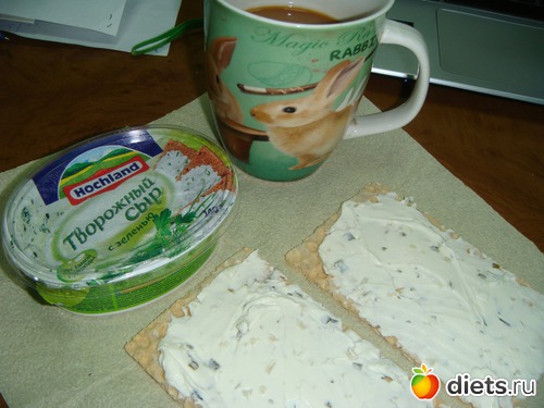 На перекус съела два хлебца "Елизавета" с творожным сыром и выпила чашку цикория.