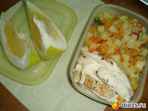 Обед, как и перекус проходил на работе. Кушала свити, курицу, запеченную в фольге и овощи по-деревенски фирмы "Пятый сезон".