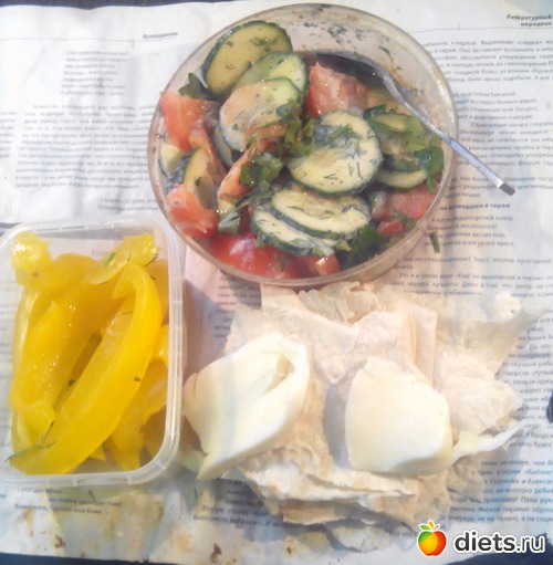 Сегодня он э-э-э совершенно вегетарианский (но не веганский!). Салат из кусочка огурца, половинки помидора и зелени. Заправлен 50 граммами ряженки Плюс половинка перца. Плюс грамм 50 лаваша и столько же козьего сыра.