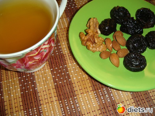 На полдник пила зелёный чай с горсткой чернослива и орешков. Решила взяться за ум, и как советовали вчера девочки, "лишнее" после обеда не кушать...