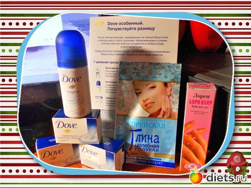 Мне достались дезодорант Dove с витамином Е (48 часов), 3 кусочка крем-мыла Dove красота и уход, Боро кейр крем для рук и ногтей на основе трав и корейская маска из целебной голубой глины с экстрактом спирулины, которая эффективна при борьбе с лишним весом и целлюлитом!