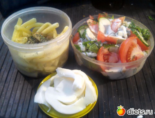 Макароны (150 грамм), салат из огурца, помидорки, сельдерея и зелени. Грамм 50 козьего сыра.