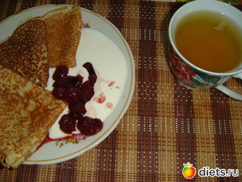 Потом пекла блины( молоко прокисло и дочь попросила блинов). Ну не смогла удержаться и на перекус нахомячилась со сметаной и вишневым вареньем. Запивала зеленым чаем.