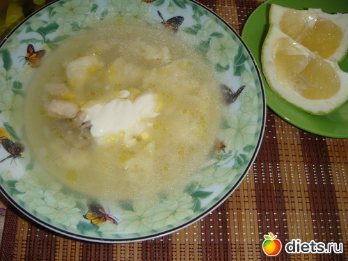 На обед, вчерашний куриный суп с клёцками (добавила немного сметаны) и свити.