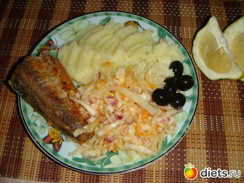 На ужин ела свити, пюре на воде, жареный хек, квашенную капусту и несколько оливок.