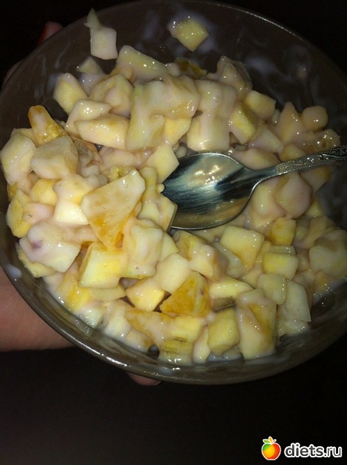 1 яблоко+1 груша+пол мандаринки + пол банана + 1 йогурт (очень захотелось фруктового салата) много конечно, но я получила такое удовольствие