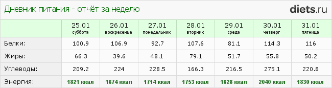 Все 7 дней я кушала на вот столько ккал. Это таблица, на которое есть фотоменю