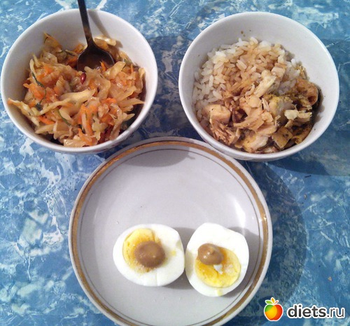 Салат тот же самый, что и вчера. Рис с курицей. Одно вареное яйцо, с горчицей.