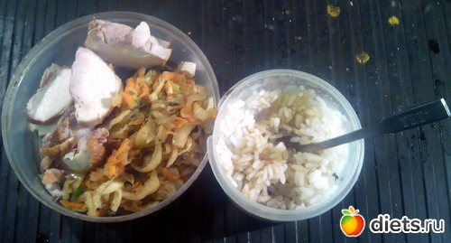 Немного салата, курица и рис. Плюс пара мармеладок. Но их все уже видели, поэтому я их фотать не стал.