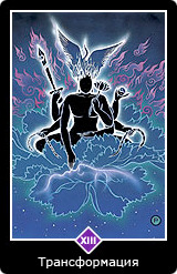Фигура в центре этой карты находится на вершине цветка безграничной пустоты. Она держит в руках символы трансформации: меч, который рассекает иллюзию, змею, которая омолаживает себя, сбрасывая кожу, разорванные цепи ограничений и Инь-Янь — символ выхода за пределы двойственности. Одна рука покоится на бедре, открытая и принимающая. Другая идет вниз и касается рта на лице спящего человека, символизируя тишину, приходящую в отдыхе.