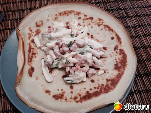 Один с салатом (копченая курочка, огурец, колбасный сыр, зелень и майонез)