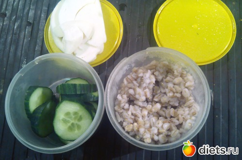 Кусок огурца, перловка (150 грамм), козий сыр.