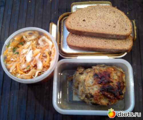 Капустный салат, курино-яблочная котлета и два кусочка хлеба. Второй кусочек хлеба был явно лишним, но понял я это только тогда, когда его дожевал. Но котлета вкусная получилась!