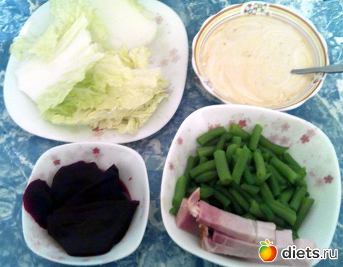 Пекинка. Отварная свекла, приправленная бальзамическим уксусом и соевым соусом. Отварная стручковая фасоль. Традиционный соус из ряженки смешанной с яблочным укусом, соевым соусом и горчицей.