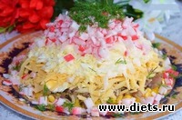 Можно выложить слоями: кукуруза, грибы, лук, сыр, яйца, краб палочки. Смазать майонезом или сметаной.