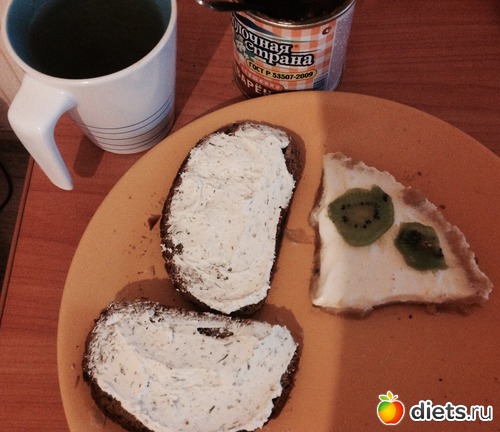 Завтрак был как всегда вкусным и нехудейным: два бутерброда с творожным сыром и зеленью, последний (!) кусочек пирога с киви и пара ложек вареной сгущенки.