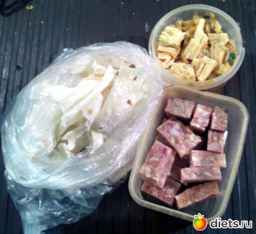За окном морозная утренняя тьма, поэтому еда сытная. Лаваш, прессованное мясо и капустный салат, перемешанный с соевой спаржей.