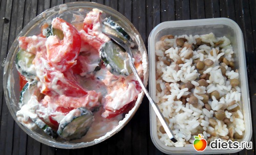 Салат из помидора с огурцом, заправленный самодельным греческим йогуртом. И рис перемешанный с чечевицей.