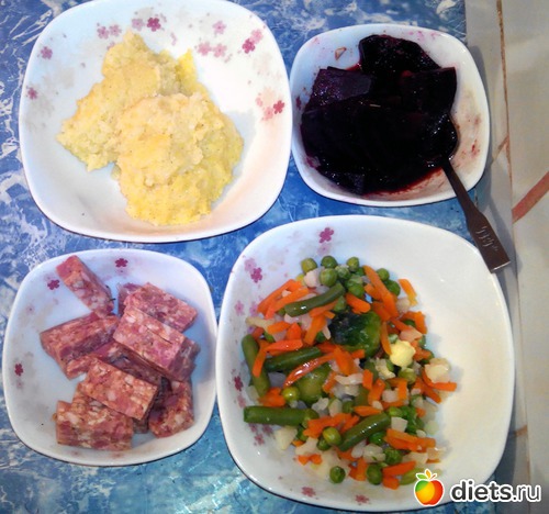 Овощная смесь "Весенняя". Свекла, заправленная бальзамическим уксусом, соевым соусом и капелькой растительного масла. Пшенная каша и прессованное мясо.