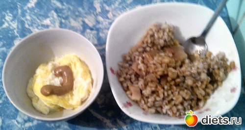 Все-таки геркулес с ряженкой еда летняя, поэтому сегодня на завтрак перловка с салом и яйцо из микроволновки.