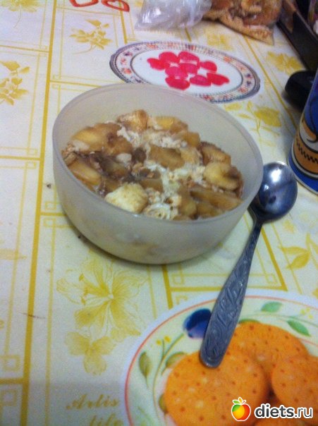 Хлопья про которые я уже как то писала, банан и молоко, на ночь сделала и с утра супер завтрак