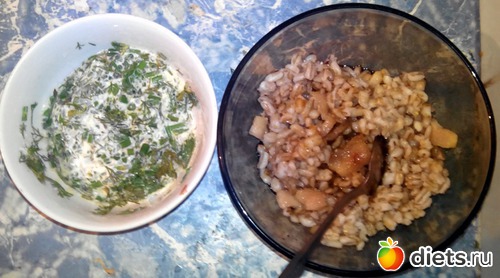 Перловка с салом и яйцо с зеленью.
