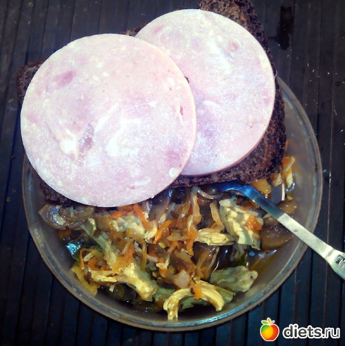 Капустный салат перемешанный с остатками соевой спаржи и грибами. И два кружка ветчины "Полтавской" на кусочке хлеба.