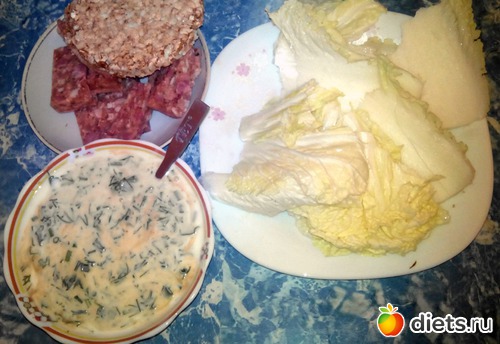 Пекинка. Кефир с зеленью, соевым соусом, яблочным уксусом и горчицей. Прессованное мясо. И... Снова хлебцы! Или слайсы из цельного зерна. Очень вкусные!
