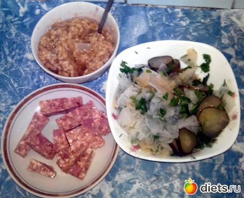 Салат из дайкона, соленый огурец, сельдерея и зелени. Геркулес с салом - ну это уже традиция! И прессованное мясо.