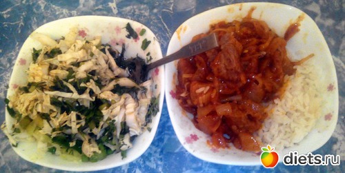 Салат из пекинки, сельдерея и зелени. Заправка традиционная. Отварной рис и... то, что моя жена, которая эту вкуснятину готовила, назвала "поджаркой по-сибирски". Это свинина тушеная с луком, квашеной капусты и томатной пасты.