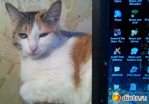котейка милая,трёхцветка)))) у меня тоже трехцветка,от мамы осталась. говорят,они счастье приносят.