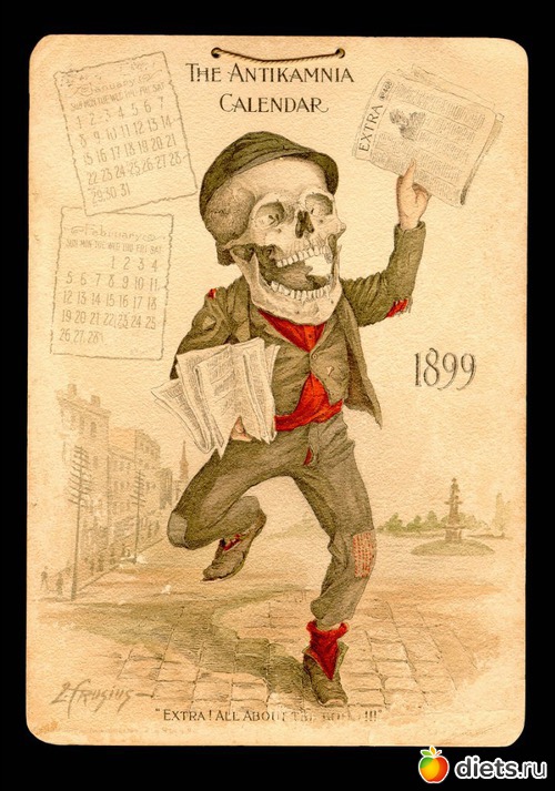 Между 1897-ым и 1901-ым годами было выпущено пять календарей компании «Антикамния», содержавших тридцать «вдохновлённых смертью» рисунков Крусиуса. «Антикамния» проводила довольно агрессивную рекламную кампанию, в рамках которой календари (предназначавшиеся для коллег-медиков) вкупе с открытками и пакетами с бесплатными образцами лекарств распространялись среди врачей в Соединённых Штатах и за границей."