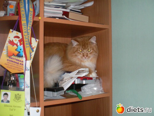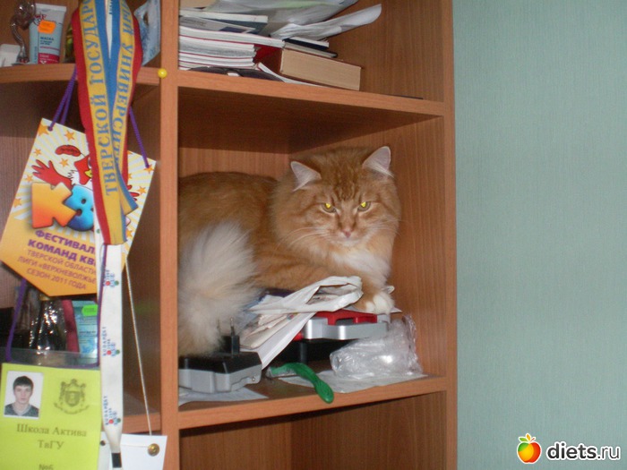 там сначала у сына тетради лежали, кот сверху пристраивался, а потом уж мы барину полочку освободили