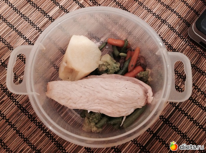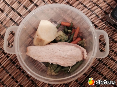 В обед я съела индейку на пару без соли и приправ, пареные овощи и половину вареного картофеля