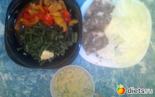 Пекинка. отварная стручковая фасоль, ряженка с зеленью, лечо покупное и мясная запеканка.