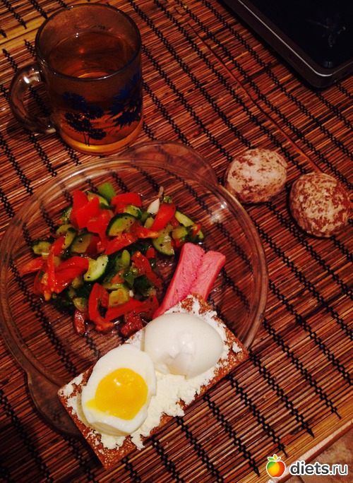 Завтрак был похож на все предыдущие)) свежий салат, хлебец с творожным сыром и яйцом, сосиска, два пряника и зеленый чай.