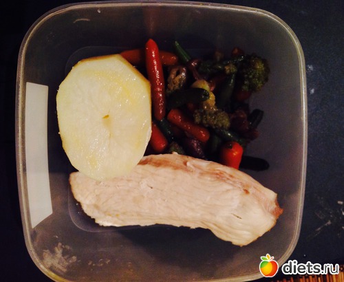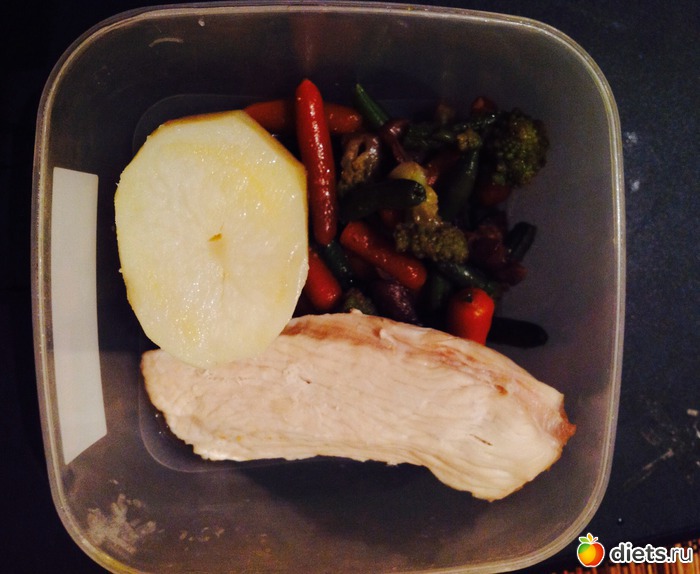 А в обед повторила понедельничный рацион : индейка на пару без соли и специй, пареные овощи и половина вареного картофеля.