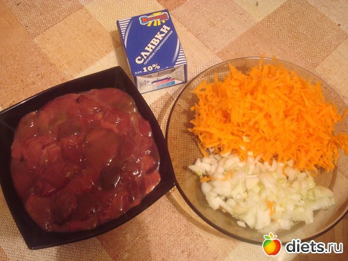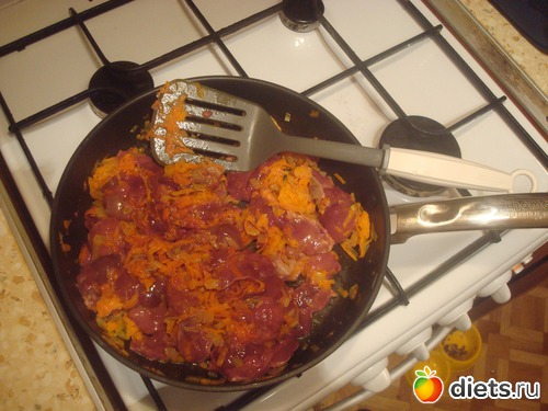 3. когда морковь станет мягкой а лук прозрачный добавляем печень